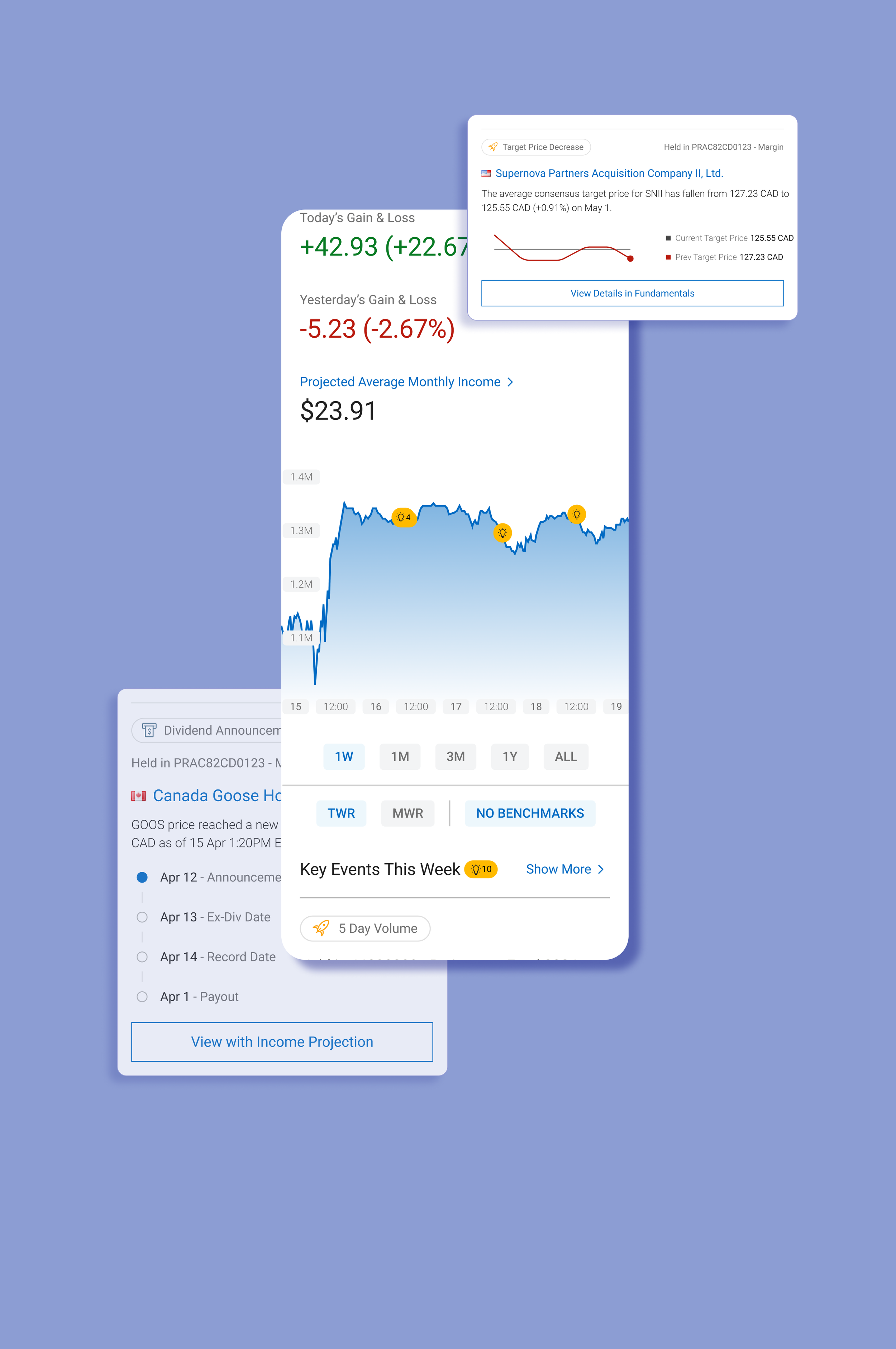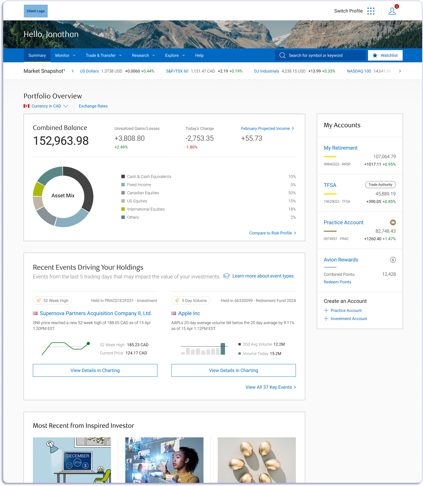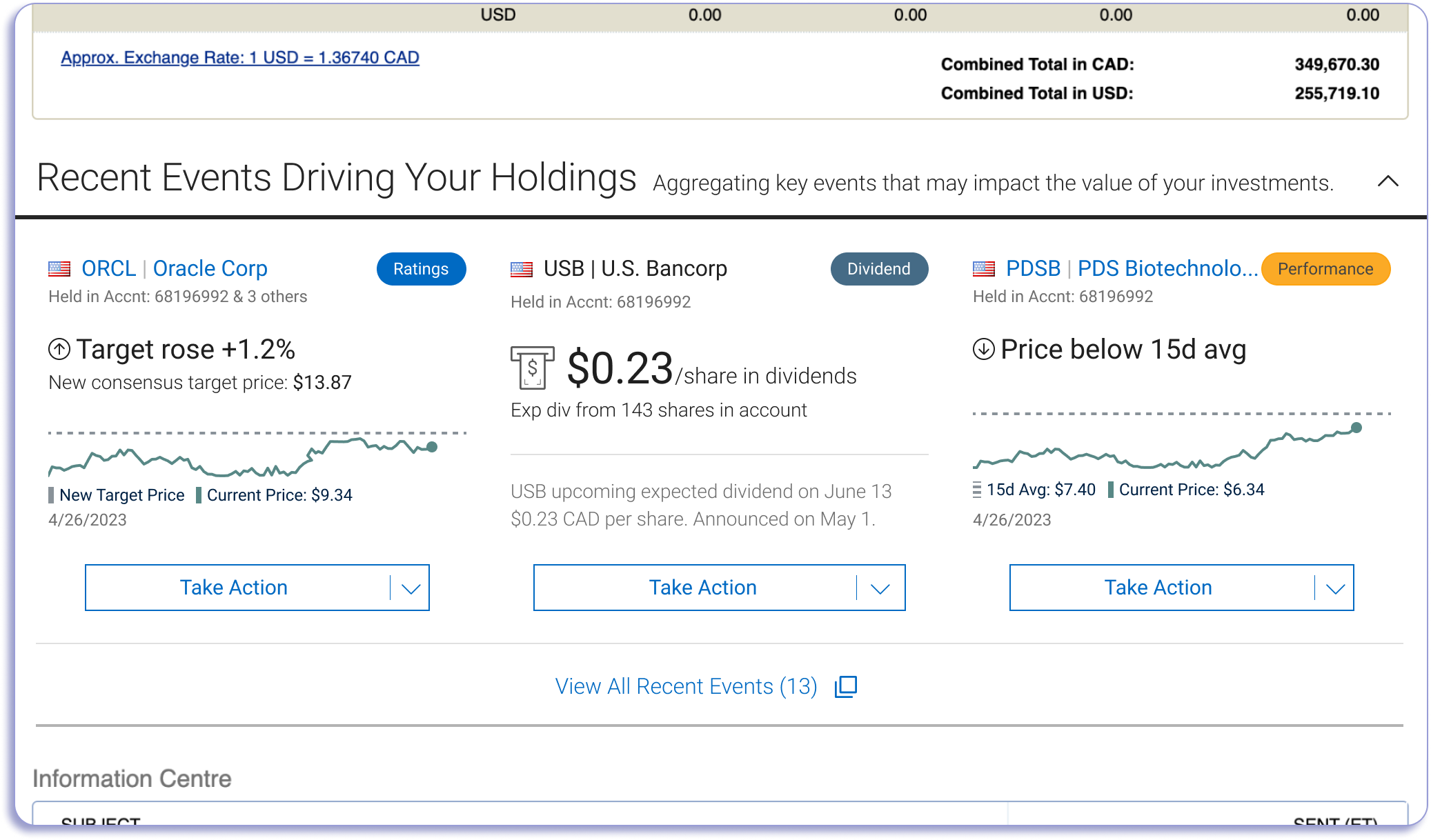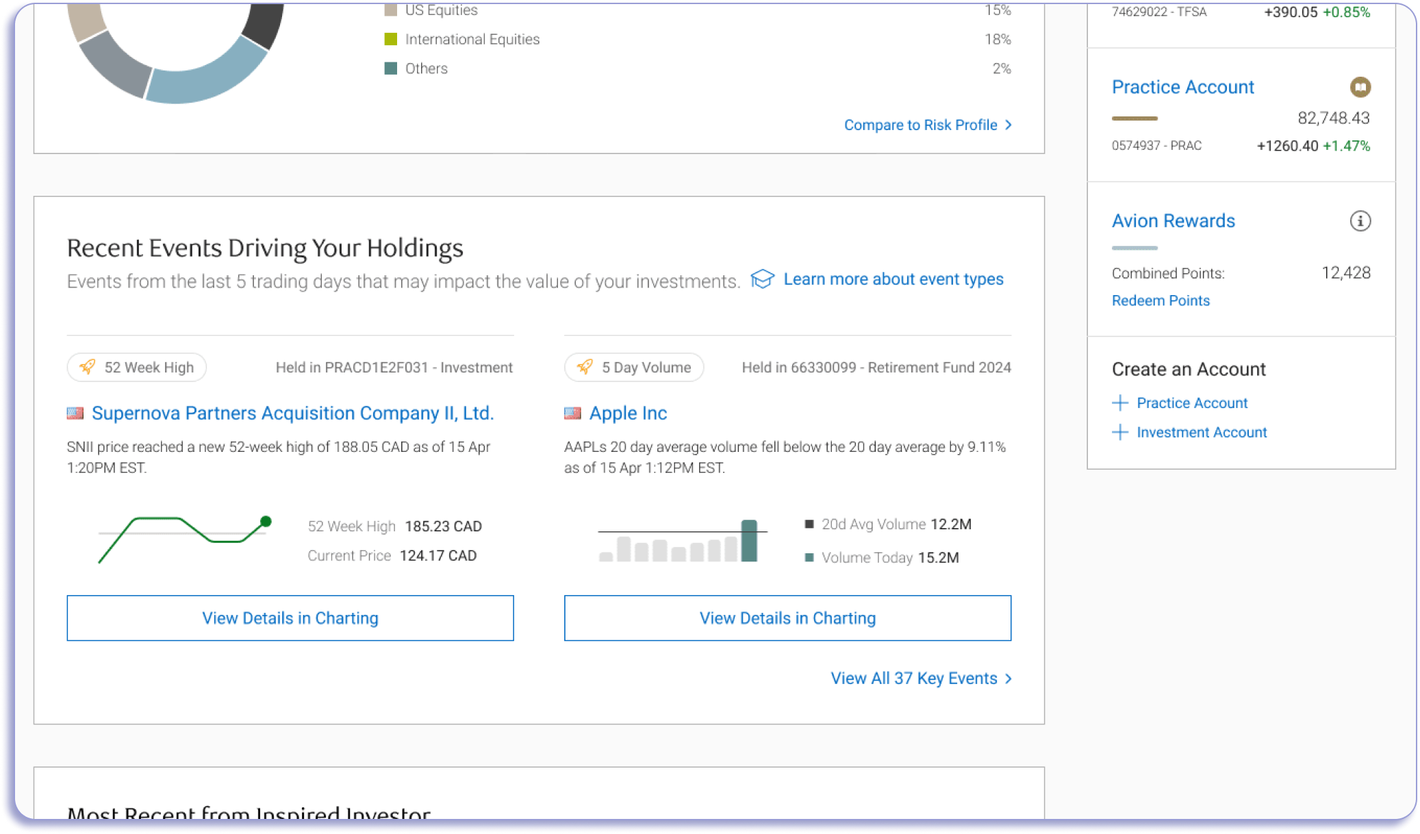 Module Design: Designed the full "Recent Events Driving Your Holdings" module with real-time updates, event tags, smart contextual text, account context, clickable company links, and event-specific CTAs
