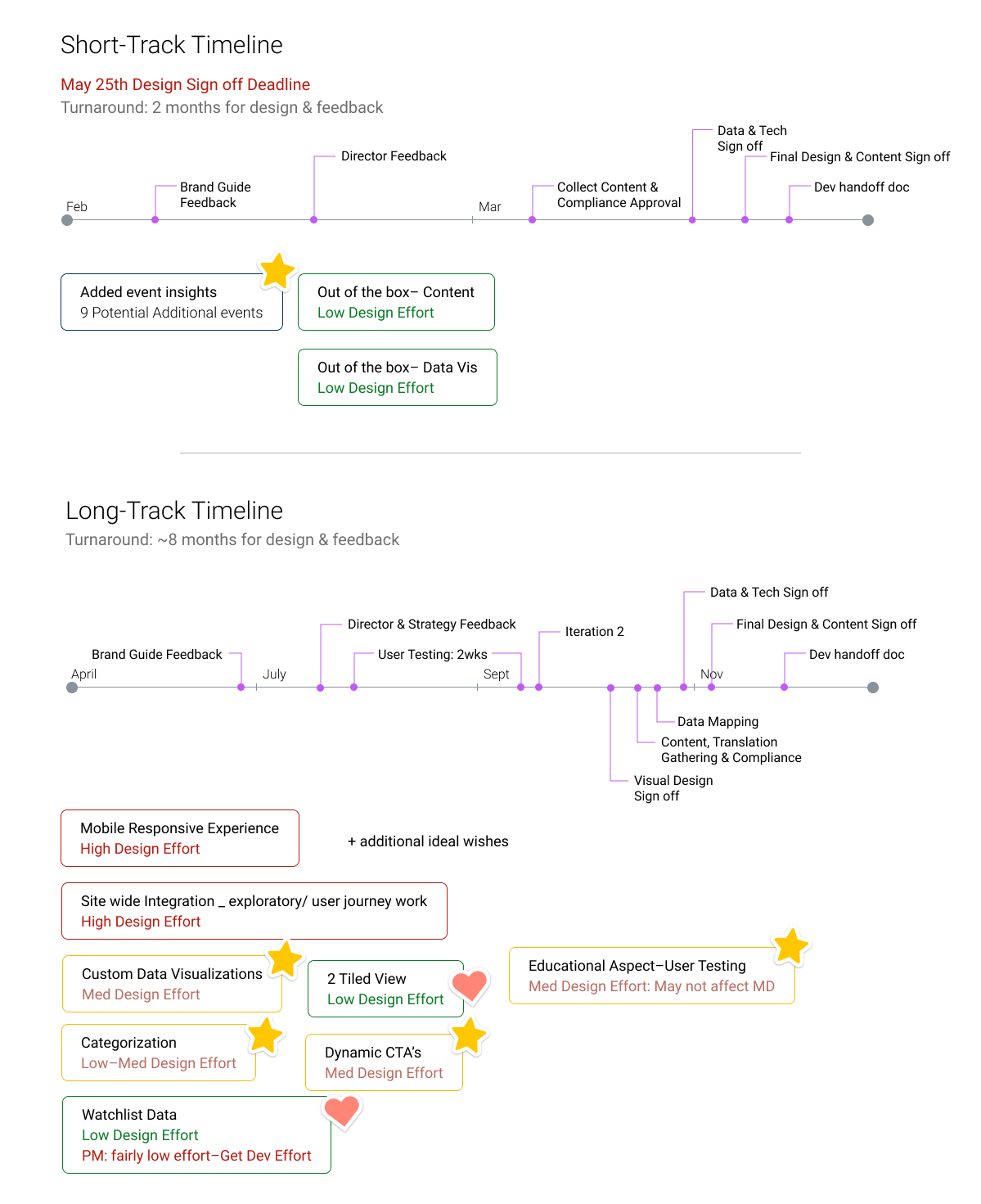 Based on the success criteria provided by the client, our team recommended a “Short Track” and “Long Track” phased delivery strategy. Ship 9 new propriety event insight types quickly with minimal design disruption to prove value, then use that momentum to justify the full experience rethink. Incremental release reduced stakeholder risk while keeping the long-term vision intact.