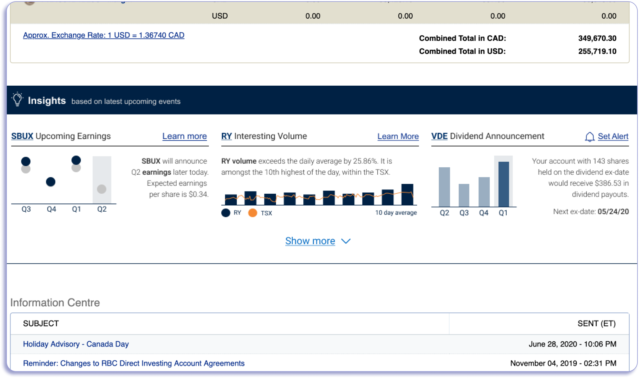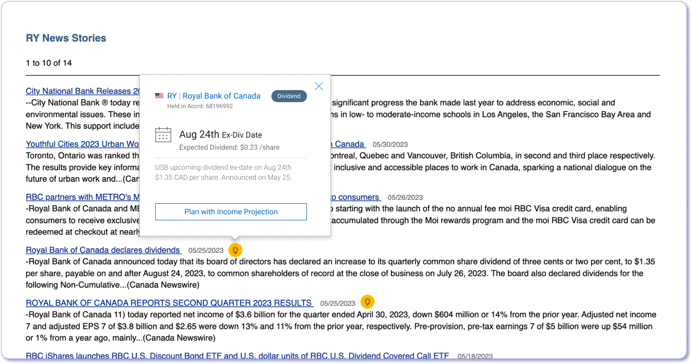 The bottom is the same concept, but bringing the insights into a text heavy page like the news portion of the site. The event insight modules add engaging visuals as well as provide quick preview to the dividend information without taking the user away from their investing journey.