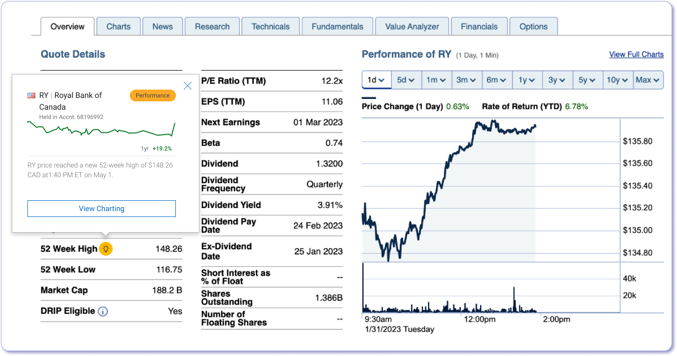 The top is a concept of bringing insights into a popover module that could act as supplemental information for novice users, highlight interesting events within the user’s holdings that is relevant to the stock that is being researched, and as a navigational component to drive traffic to other areas of the client’s site.