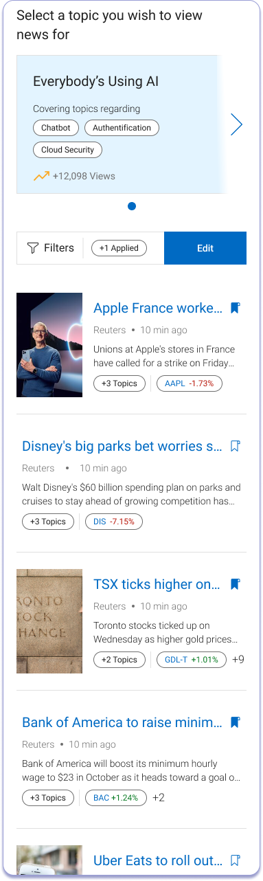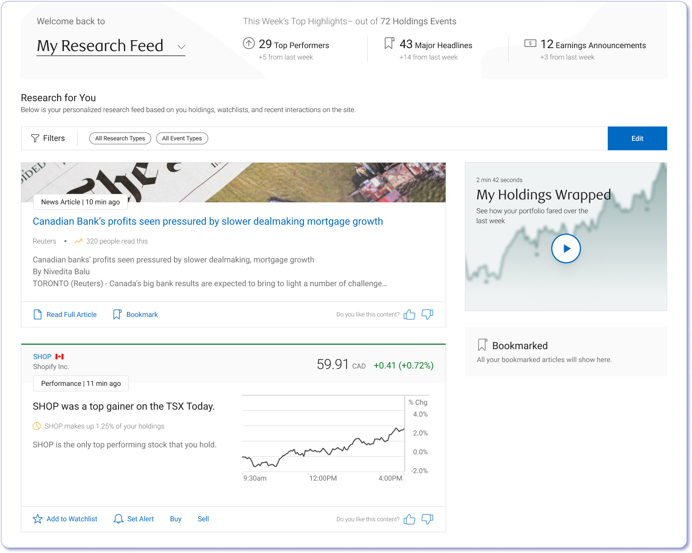 Investors don't all start in the same place, so the landing experience doesn't treat them like they do. Users land on a personalized research feed built from their holdings, watchlists, and recent activity, ensuring every visit starts with information that's immediately relevant to them.