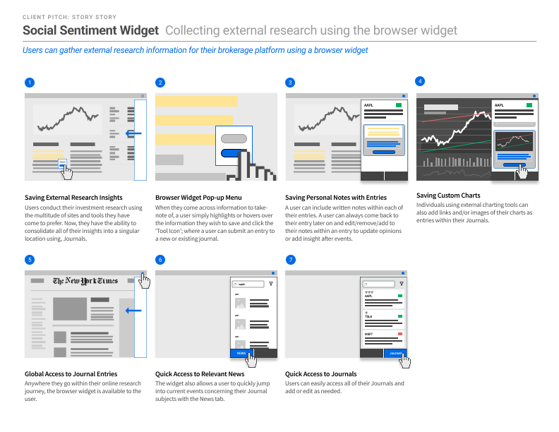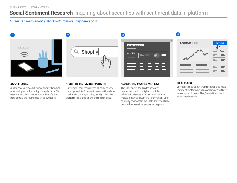 Designed a narrative-driven stock research tool that translates complex financial data into relatable, narrative-based experiences that pulls in contextual signals like CEO approval ratings and relevant social media sentiment alongside hard data, meeting new investors where they actually make decisions.