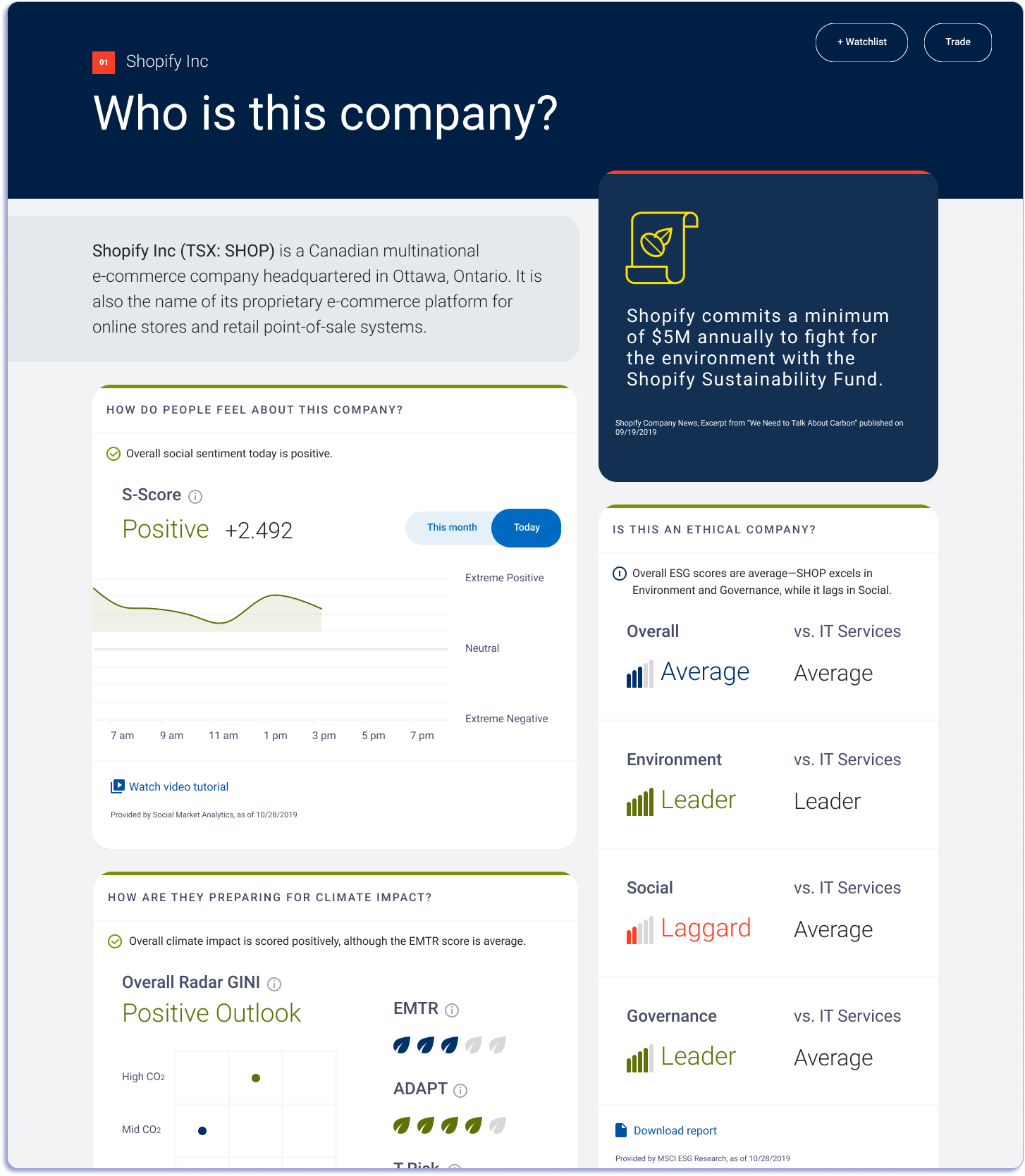 ⏴ The first page to the guided research experience. User flow for social sentiment is meant to guide investors through 3 questions to help investors determine if the security is a worthwhile investment: